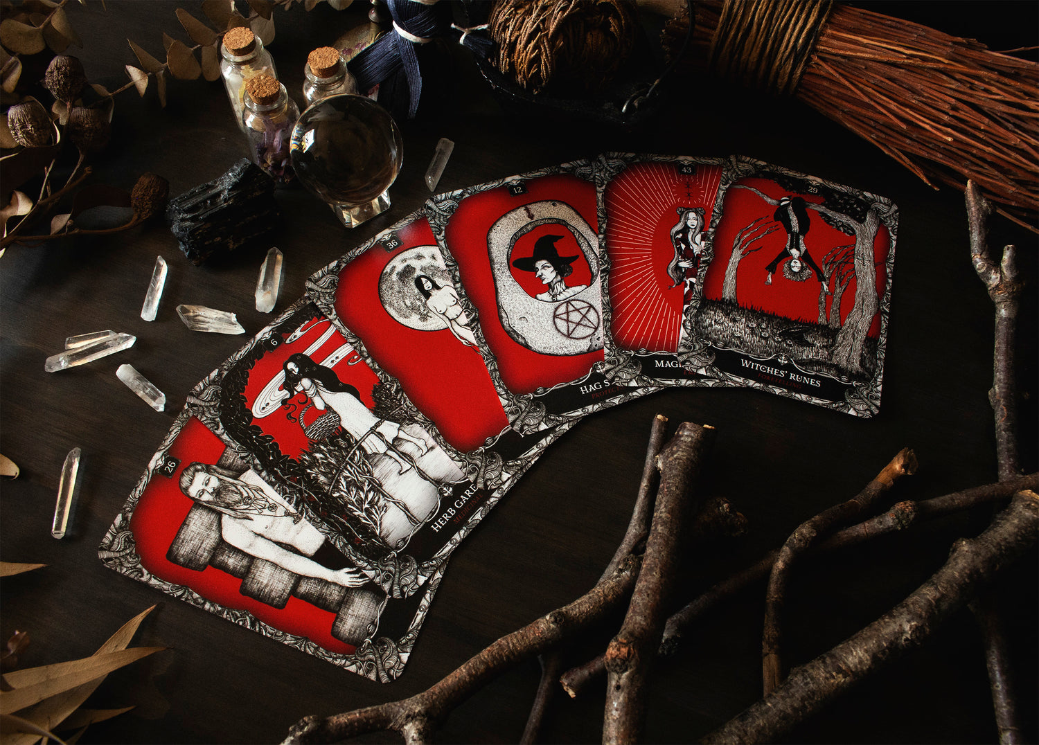 Mira illustrated 44 oracle cards of The Oracle of The Witch, written by Flavia Kate Peters and Barbara Meiklejohn-Free.